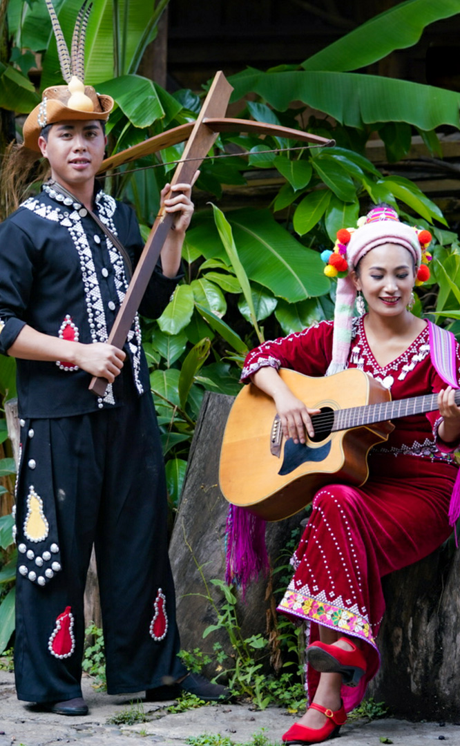 拉祜族人口約41萬,主要聚居在思茅、臨滄境內的瀾滄江沿岸地區(qū)。拉祜族寨與基諾族寨緊緊毗連,寨內建有拉祜族茅草房、大公房、教堂、牛棚以及葫蘆廣場。位于拉祜族寨中心位置的葫蘆廣場形似一只碩大的葫蘆平面,核心有一組石雕葫蘆。傳說拉祜族的祖先誕生于葫蘆中,因此葫蘆廣場表現(xiàn)了拉祜族的祖先崇拜觀念。漫步拉祜族寨,葫蘆笙悠揚婉轉、口弦聲余音繞梁,表現(xiàn)拉祜族勞動場面的“豐收擺舞”充滿歡騰和激情,展示了拉祜族的民間...